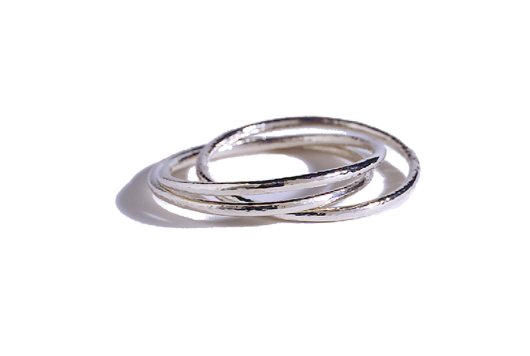 A set of three intertwined, hand-hammered Sterling Silver bangles shine with movement.