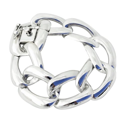 This Pat Areias classic sterling silver link bracelet is fashioned with flat contoured rectangular links, each having a substantial profile while very light to wear. Pair with the matching necklace (N970) for a stunning look. Easily transitions from day wear to evening wear.