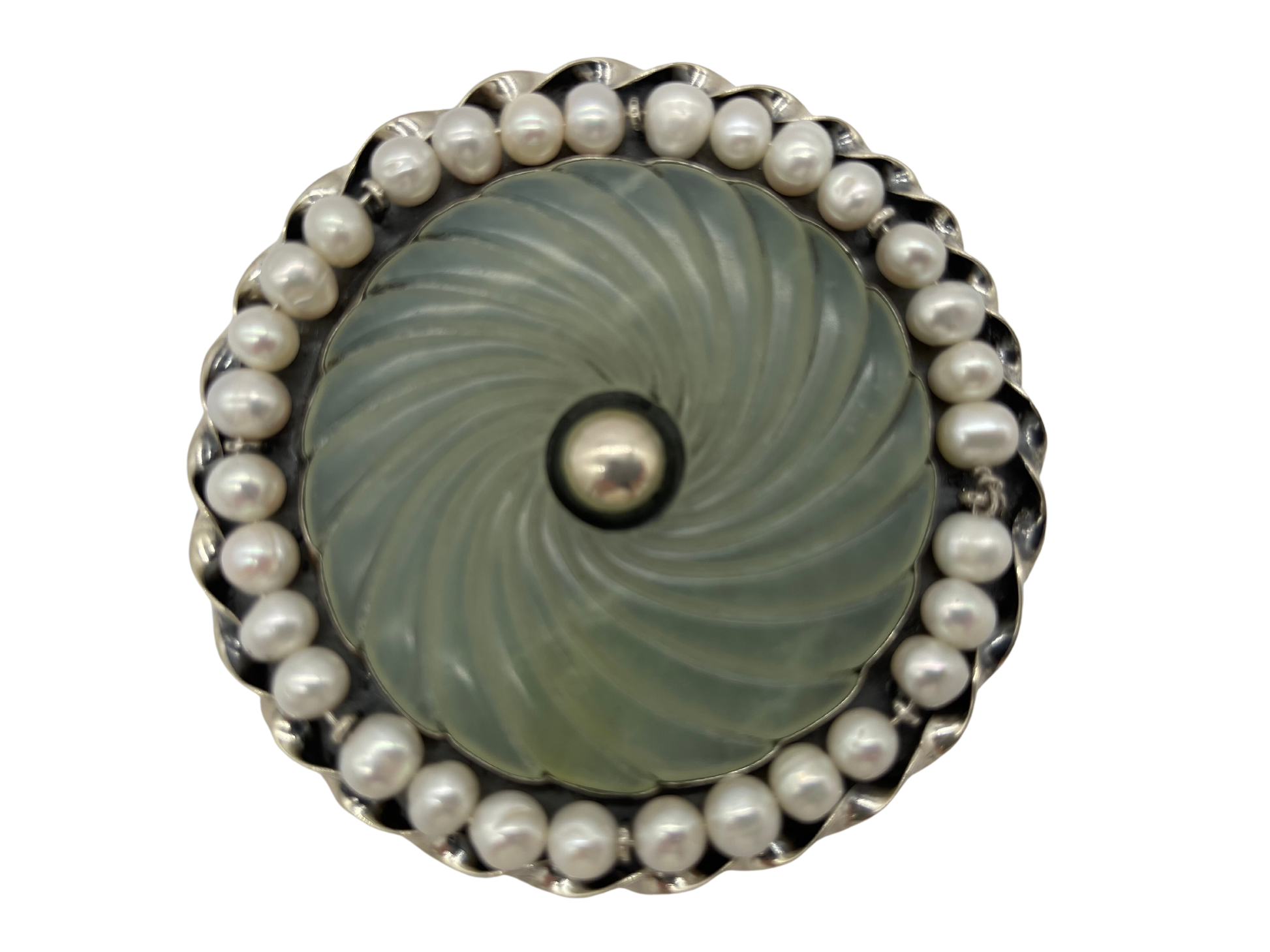 On trend with the season, a classic design with half dome sterling balls surrounding a "show stopper" stone. Two options shown: hand-carved round khaki colored jade, or a beautiful large square shaped Lapis Lazuli stone. Other stones available. Please contact us directly for other options.