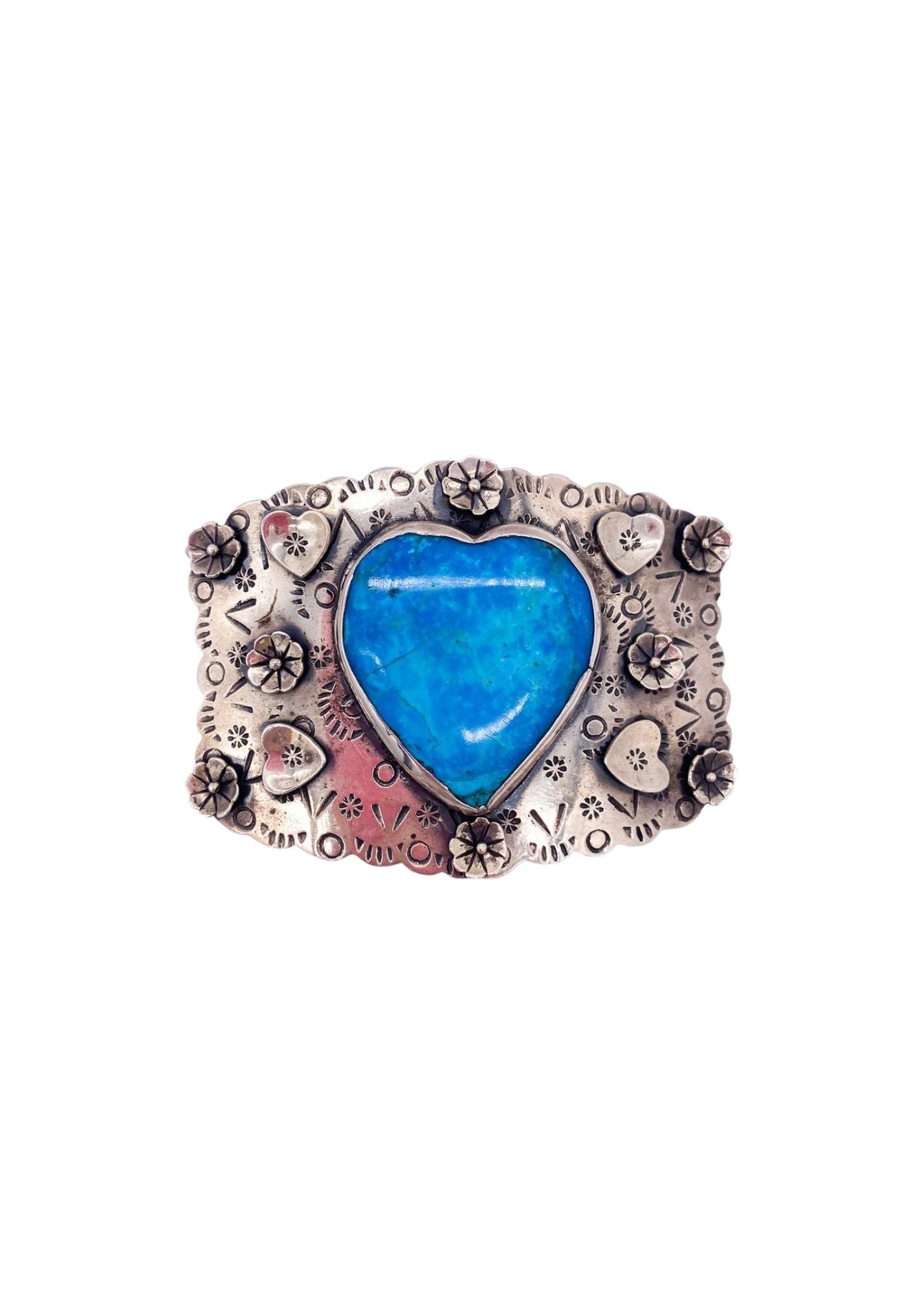 Beautiful intricate hand fabricated sterling silver buckle with a turquoise heart. Available in 1 1/2”. Straps sold separately.