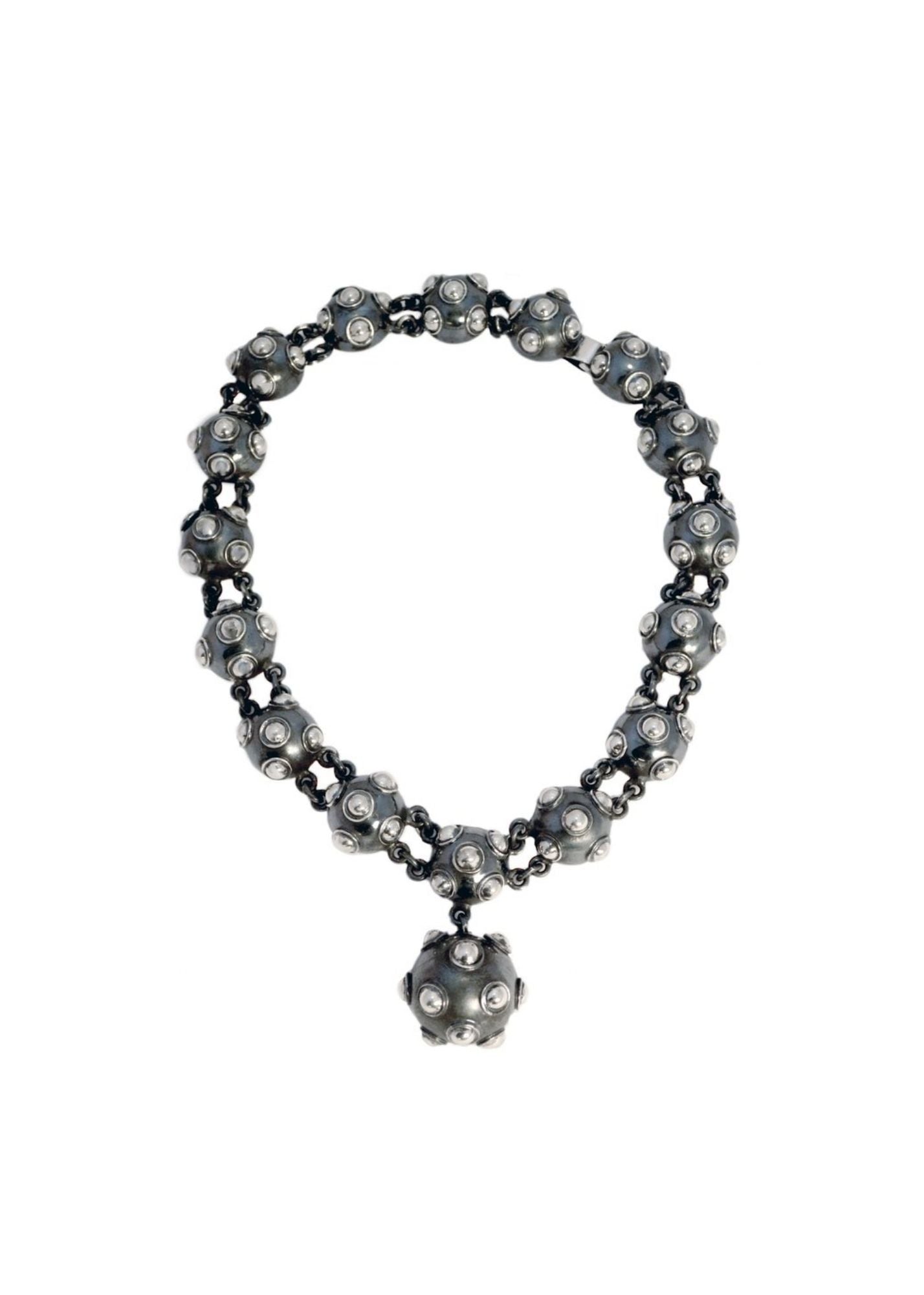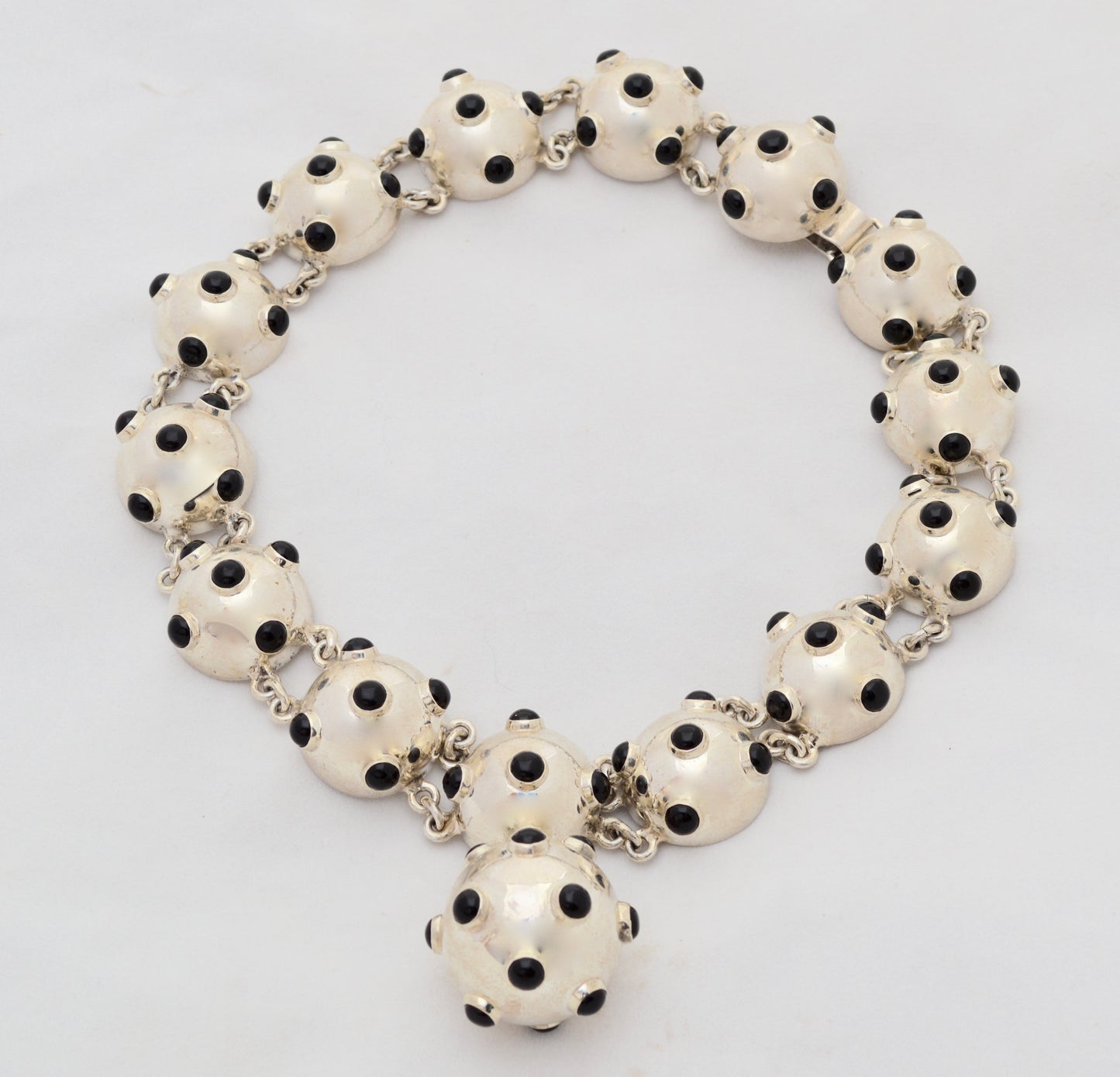 WOW! This stunning necklace is a show stopper! The necklace is fashioned with 14, 3/4" half domes each accented with 5 raised half balls. The large ball pendant measures just over 1" in diameter and is covered with half balls. Available options are: All polished, Oxidized silver with polished raised balls, Or polished silver with Onyx cabochons.