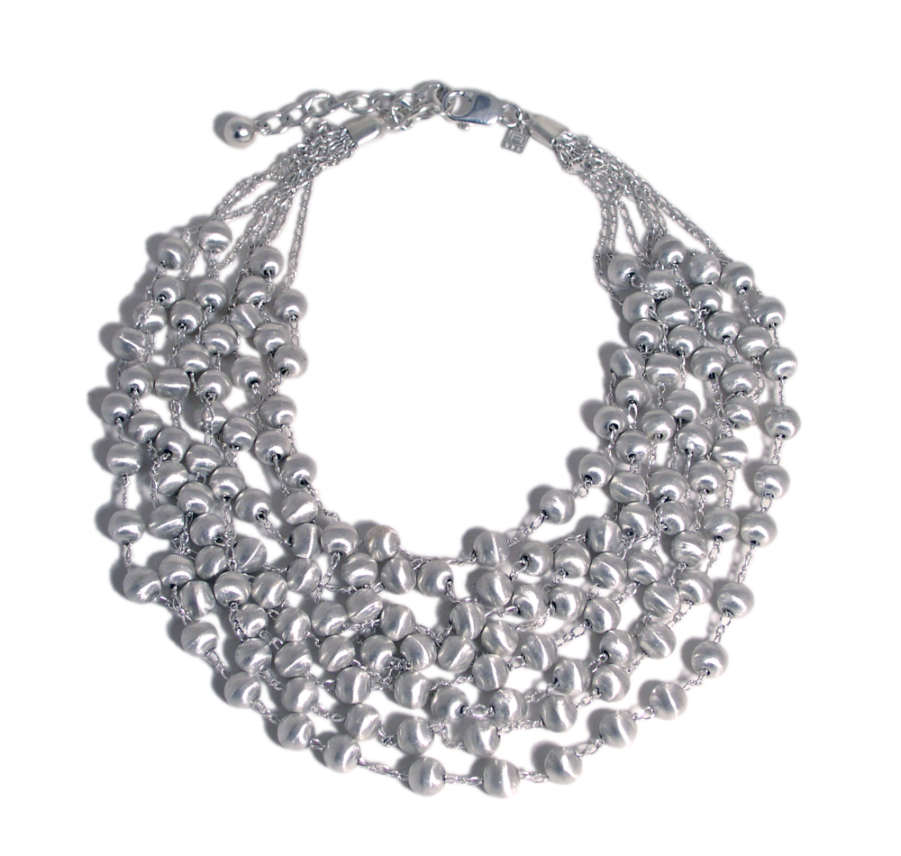 This gorgeous, multi-strand necklace features handmade brush-textured sterling 8mm balls. Strung on sterling silver chain.