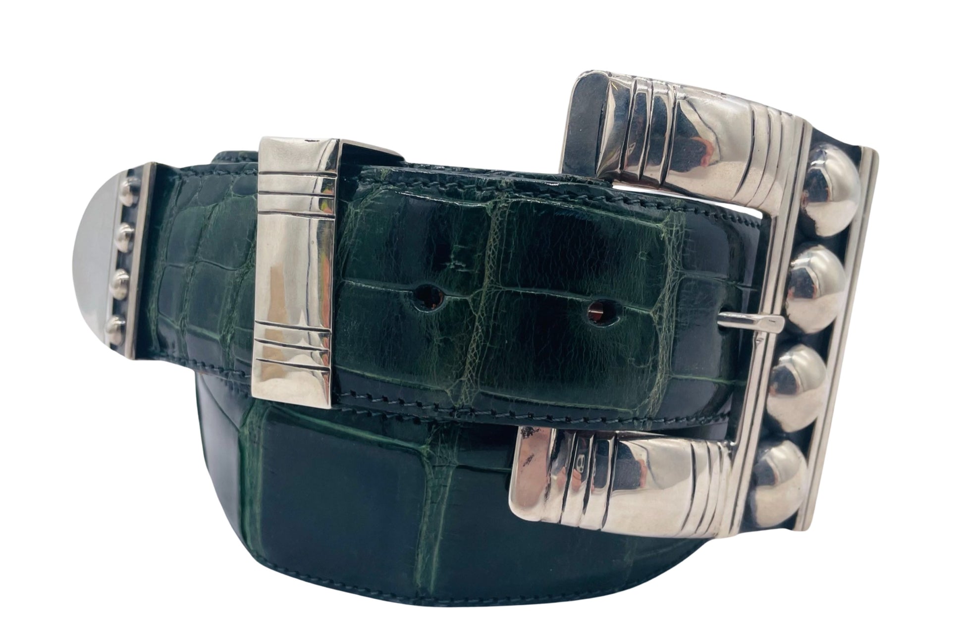 A classic Mexican inspired sterling silver buckle design that has always been one of our top sellers. Shown on a alligator belt strap. (sold separately)
